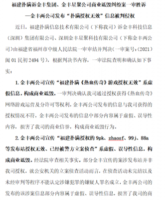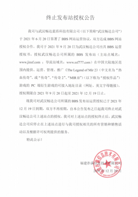202112-29我司于2021年9月20日授权域名(主域名:www.jinsf.com)在中国大陆地区范围内提供运营、管理、推广《The Legend Of Mi...